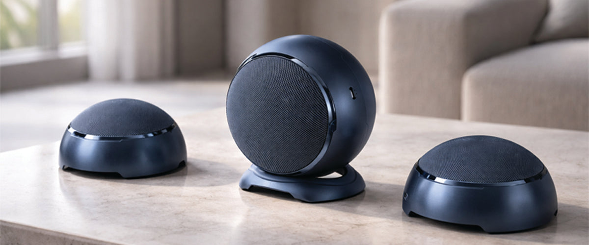 Featuring rich, crystal-clear sound and a built-in mic for hands-free calls, this unique spherical speaker magnetically connects into one powerful speaker or splits into two independent pieces for immersive surround sound.